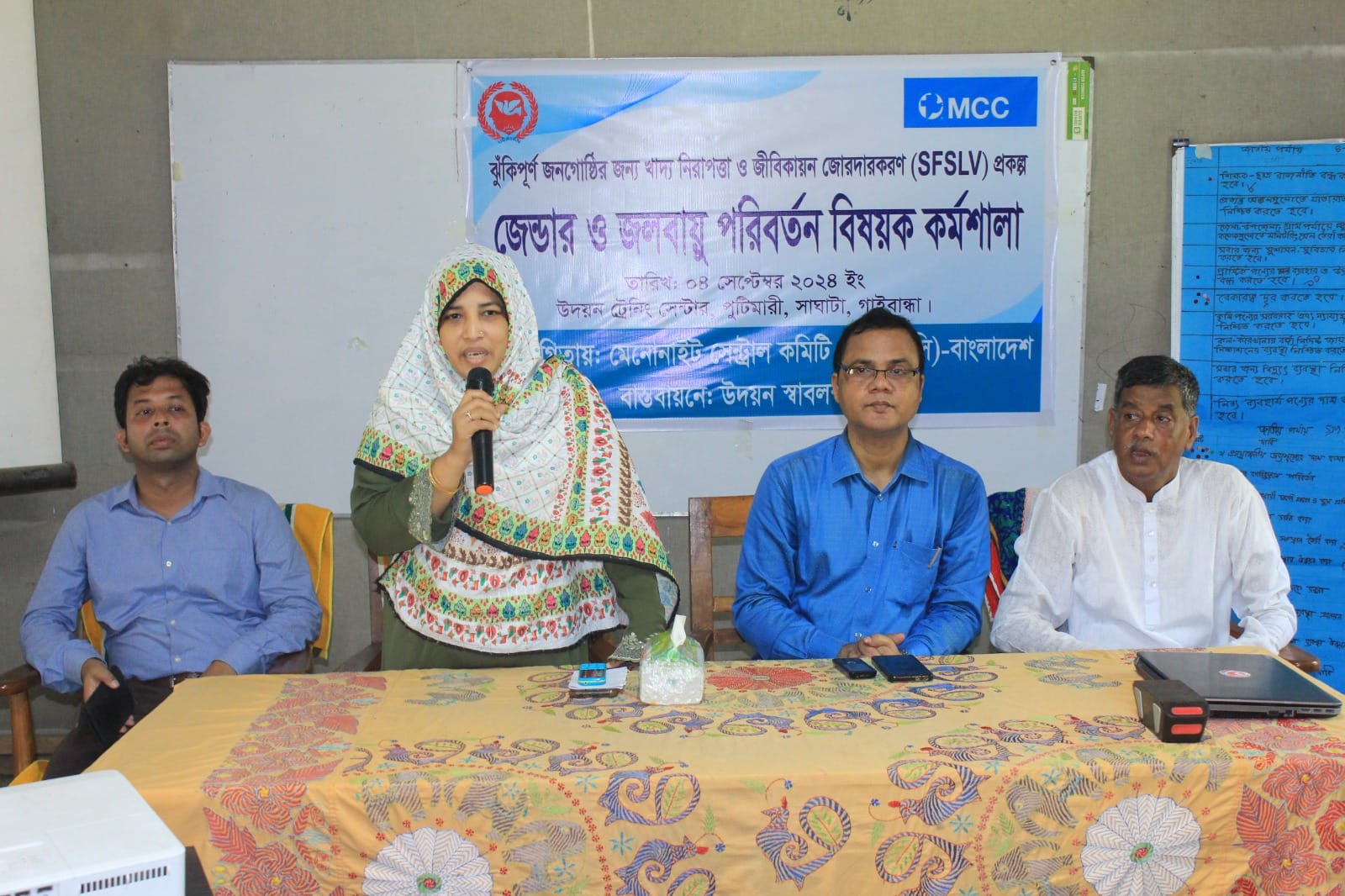 মেনোনাইট সেন্ট্রাল কমিটি(MCC)-বাংলাদেশ এর সহযোগীতায় উদয়ন স্বাবলম্বী সংস্থার বাস্তবায়নে SFSLV প্রকল্পের আওতায় ০৪/০৯/২০২৪ইং তারিখে অনুষ্ঠিতব্য "জেন্ডার ও জলবায়ু পরিবর্তন "বিষয়ক ১ দিনের একটি কর্মশালার আয়োজন করা হয়। উক্ত কর্মশালাটি সভাপতিত্ব করেন জনাব মো:শাহাদাত হোসেন মন্ডল, নির্বাহী পরিচালক,উদয়ন স্বাবলম্বী সংস্থা(ইউ.এস.এস)। উক্ত কর্মশালায় প্রধান অতিথি হিসেবে উপস্থিত ছিলেন জনাব মোছাঃ রেবা বেগম উপজেলা প্রানি সম্পদ অফিসার, সাঘাটা, গাইবান্ধা ।বিশেষ অতিথি জনাব পবন কুমার সরকার, উপজেলা মহিলা বিষয়ক কর্মকর্তা,সাঘাটা, গাইবান্ধা এবং উপজেলা অতিরিক্ত কৃষি অফিসার সাঘাটা, গাইবান্ধা ।এছাড়াও PO,FO ও সুবিধাভোগী সহ মোট অংশগ্রহনকারী ৩০ জন।